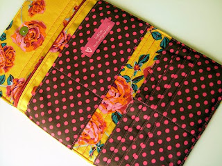 Forrada com um tecido verde às bolinhas, conjudado com dois outros tecidos em verde e em laranja. Tem dois bolsos internos, afinal temos sempre tantas coisas e coisinhas para guardar ;)